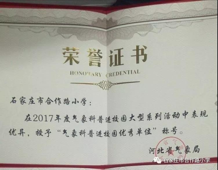 活动现场,河北省气象局气象服务中心科普宣传领导成海民亲自为石家庄市合作路小学颁奖,正式授予该校“气象科普进校园优秀单位”荣誉称号,白彦凯老师代表学校领奖。