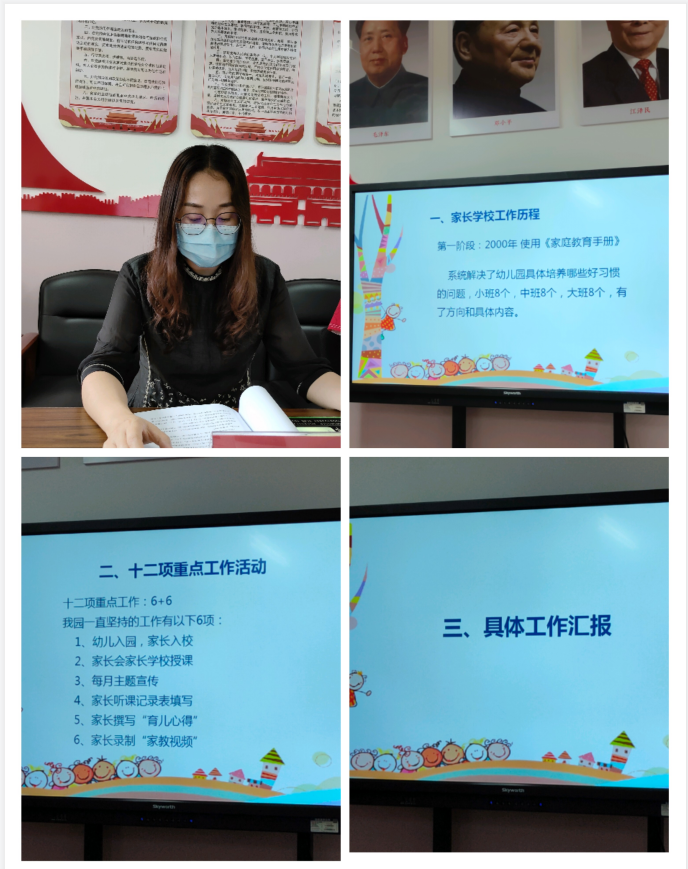 市直幼儿园的家长学校从2012年开始运行,特别是在新乐市新时代家长学校试验区实施以来,持续发力,家长注册率、听课率均达到100%,大作业完成率也在80%以上,每个月的线下沙龙活动开展的丰富多彩,习惯之星评选的覆盖面广,得到了家长的广泛认可,初步形成了家园协同育人的良好局面。该园主任田会欣从家长学校工作历程、十二项重点工作及具体工作安排进行汇报。