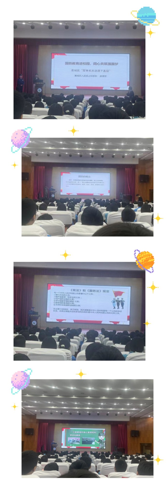 然后,藁城区人武部上校部长赵德军进行了精彩的宣讲。赵部长主要讲授了三个方面的问题。第一、什么是国防,公民的国防义务有哪些?对于什么是国防,赵部长不仅准确的解释了概念,还通过一段穿越短片,让学生具体生动的理解了国防的真正含义。第二、为什么要进行国防建设。赵部长教育学生一定要牢记革命先烈和他们的光辉事迹,他们才是我们最应该尊崇的英雄!第三、青少年对于国防建设应该怎么做。