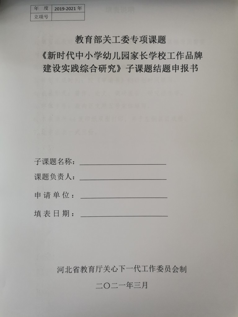 1.各课题组认真填写《教育部关工委专项课题“新时代中小学幼儿园家长学校工作品牌建设实践综合研究”子课题结题申报书》一式三份(见附件1)。