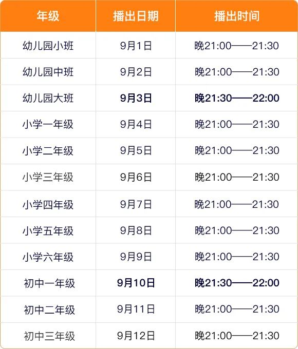 《新学期家长第一课》将于9月1日—9月12日晚间黄金时段在河北广播电视台少儿·科教频道、“河北家长在线”微信公众号和河北广播电视台冀时客户端上分年级同期播出。每个年级具体播出时间如下: